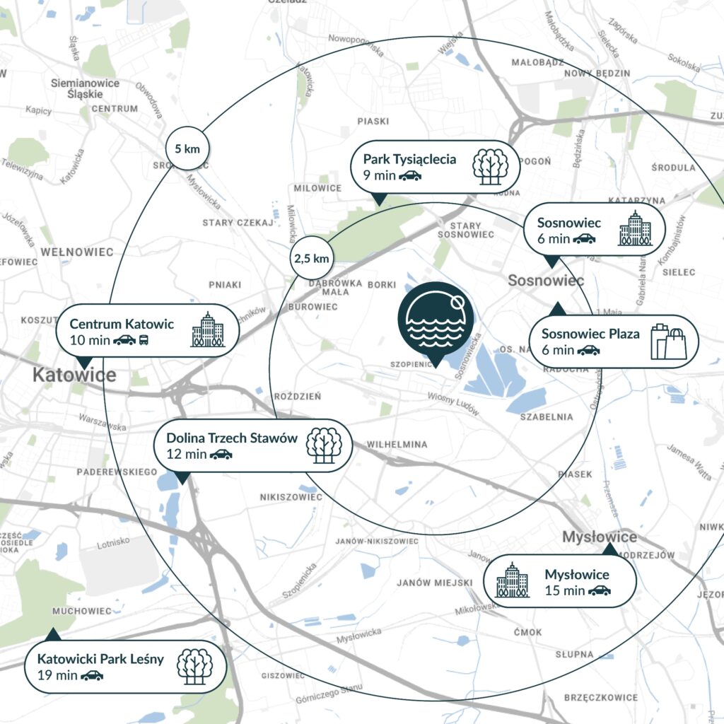Osiedle 5 Stawów zlokalizowane jest przy ul. Osiedlowej w Katowicach. Zamieszkasz więc w stolicy Śląska, ale w spokojnej, zielonej oraz świetnie skomunikowanej okolicy, zaledwie 10 minut od centrum. Zyskasz wygodny dojazd zarówno do śródmieścia, jak i innych dużych miast regionu. Dzięki pobliskim przystankom autobusowym i stacji PKP, a także szybkiemu wyjazdowi na główne trasy aglomeracji zaoszczędzisz czas każdego dnia. Wszystko, czego potrzebujesz – sklepy, szkoły, restauracje i usługi – będziesz mieć w zasięgu kilku minut.