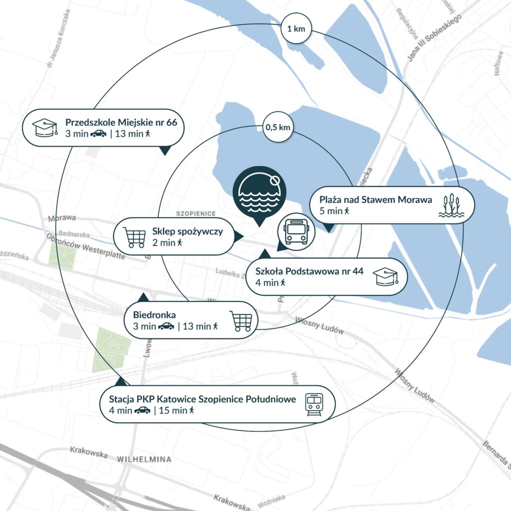 Tu codzienność toczy się wolniej. Zaledwie kilka kroków od domu będziesz mieć staw Morawa i inne atrakcje zespołu przyrodniczo-krajobrazowego Szopienice-Borki. To idealne miejsce na spacer, jogging, przejażdżkę rowerem albo chwilę ciszy z widokiem na wodę. W pobliżu znajdziesz również inne zbiorniki wodne z plażą i kąpieliskiem, boiska, ścieżki rekreacyjne oraz tereny zielone, które pozwolą Ci naprawdę odpocząć od miejskiego zgiełku.