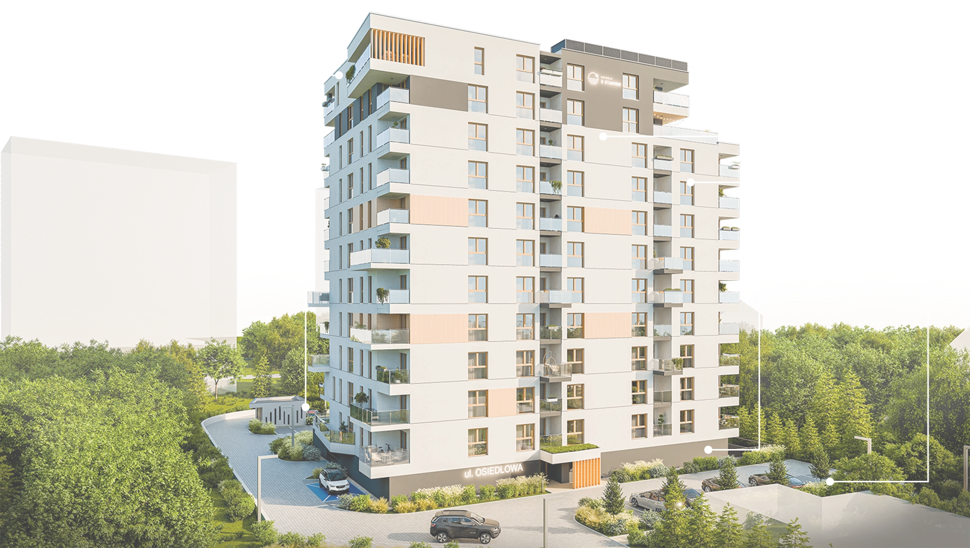 Każde mieszkanie ma balkon, taras lub loggię, czyli dodatkową przestrzeń do odpoczynku na świeżym powietrzu. Komórki lokatorskie ułatwiają przechowywanie i dbanie o porządek. Natomiast dla właścicieli samochodów przygotowano miejsca postojowe w garażu podziemnym, na parterze i na zewnątrz. Masz więc zapewnioną wygodę parkowania oraz bezpieczeństwo każdego dnia.